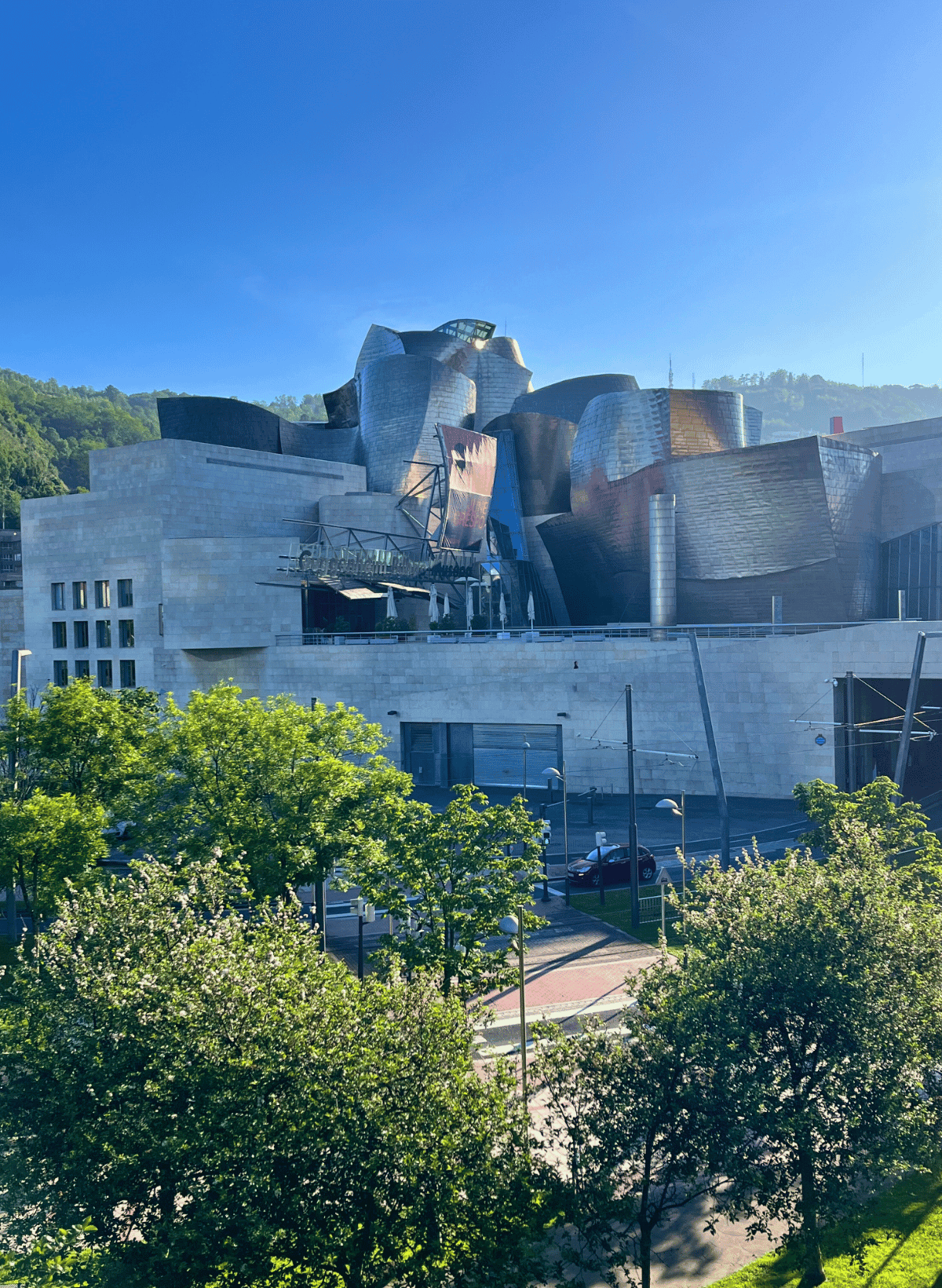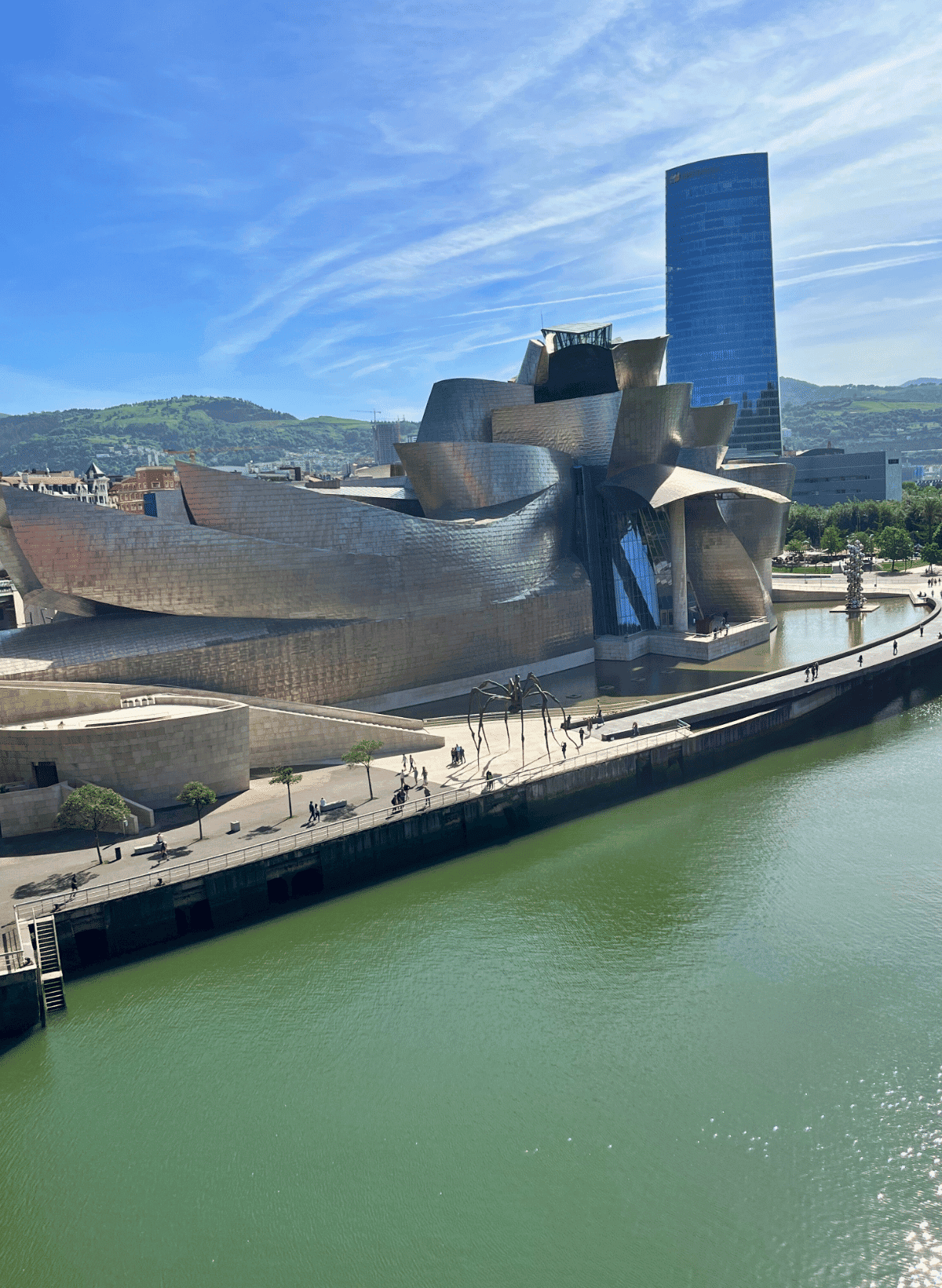Built in 1997 and designed by Frank Gehry, the structure represents a ship in the waves, made of titanium, limestone, and glass.