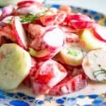 It doesn't have to be cucumbers and sour cream, as a traditional Russian cucumber salad might use. This recipe uses yogurt with the addition of fresh radishes and tomatoes.